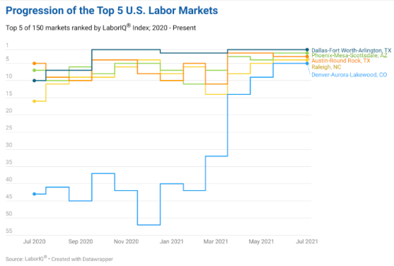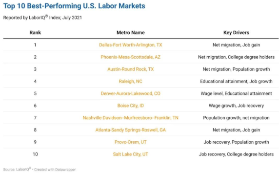 该公司的 LaborIQ 智能软件跟踪 10 项表现指标,对全美劳动力市场进行排名。在排名前 10 的市场中,有 8 个市场在净移民方面排名前 25 位,这代表着人口迁移到这些地区而不是自然人口增长。