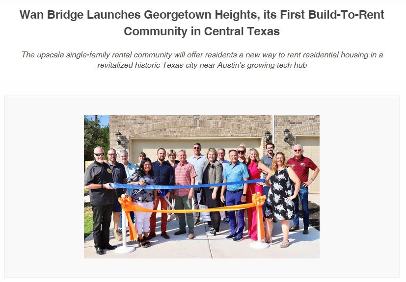 “我们热烈欢迎租户来到Georgetown Heights,这是我们在奥斯汀蓬勃发展的细分市场中的第一个定制型长租别墅社区。”Wan Bridge首席执行官Ting Qiao 说到。“租户可以期待所有 Wan Bridge 的品质,如现代、贴心的设计,高品质的配饰、我们物业管理服务和24/7 全天候维修服务。”